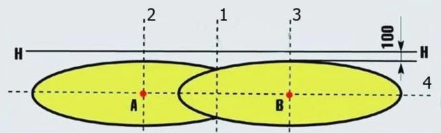 - Провести на экране две вертикальные линии, перпендикулярные центрам излучателей ПТФ (2 и 3 на схеме).