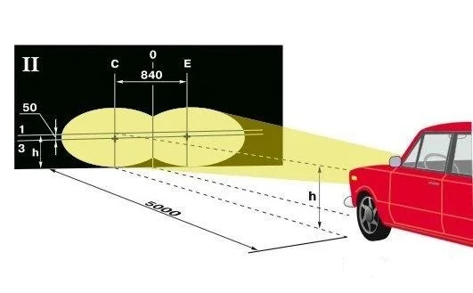 Схема регулировки передних фар ВАЗ 2107, по которой следует разметить экран показана на рисунке.