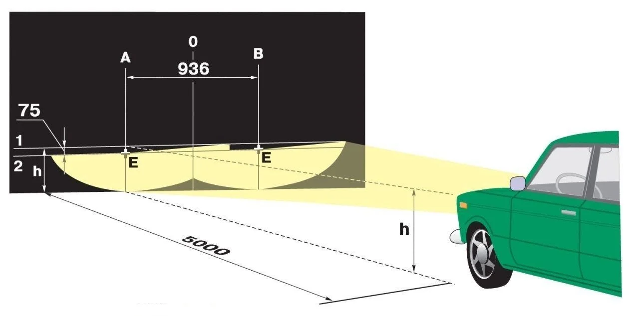 Схема регулировки фар ВАЗ 2107: h – расстояние центра фары от земли, A и B – линии вертикальной проекции центра фар, 0 – вертикальная проекция центральной оси авто, 1 – линия проекции центра фар, 2 – линия светотеневой границы (СТГ), Е – точки центров «галочек» СТГ.