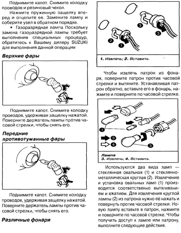 Рекомендаций не так уж и много. Запомнив их, можно уберечь себя от лишних затрат и нервов. Что же касается самих процедур замены ламп, то они детально описаны в специальной инструкции, созданной производителями Suzuki Grand Vitara. Обратите внимание на иллюстрации и советы, которые позволят безупречно установить лампочки как в салоне автомобиля так и лампочки в габаритных, задних фонарях, поворотниках, ПТФ и лап ближнего/дальнего света.