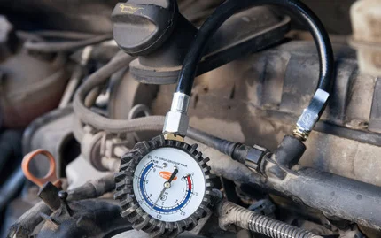 - Неисправность топливного насоса. Уменьшение производительности топливного насоса приводит к перебоям в подаче топлива. Проблема обычно прогрессирует по мере нагрузки: на холостых выражена слабо, а при ускорении мотор откровенно дергается и глохнет. Для проверки насоса на инжекторном авто нужно манометром измерить давление в топливной рампе, на карбюраторе – после насоса, на дизеле – на выходе из ТНВД.