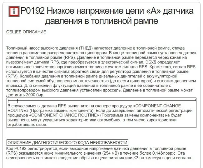 P0192 — Низкое напряжение цепи «А» датчика давления в топливной рампе. Проблема может быть в разъеме датчика, проводах, в разъеме ЭБУ. Подробно описано ниже. А еще все же по данной ошибке бывает проблема например в забитом топливном фильтре, почитайте тут комментарии, какие причины были у автовладельцев с такой ошибкой.