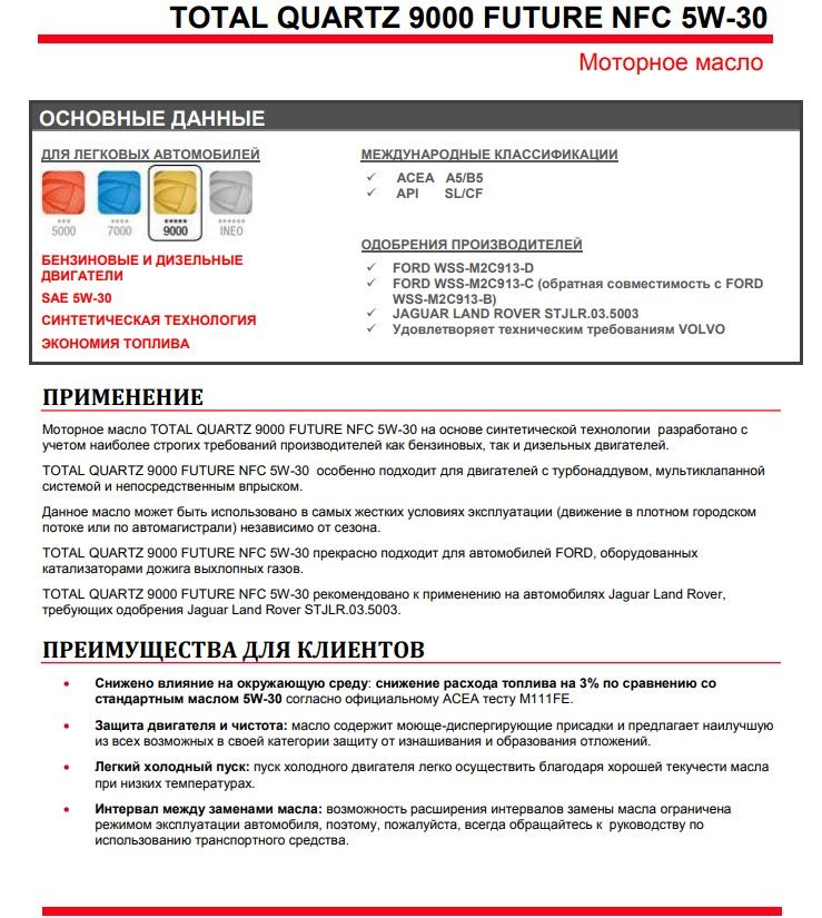 Можно заливать, но лучше использовать моторное масло классификации API SM или выше (SN), а масло Total Quartz 9000 Future NFC 5W-30 классификации SL. Достаточно 3,3 литра.