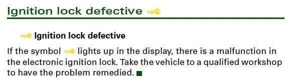 Это означает — неисправен замок зажигания. Проведите диагностику сканером, считайте ошибки и проведите по ним проверки. Проблема может быть например в плохом контакте разъема замка зажигания.