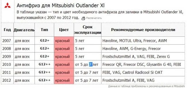 Какая охлаждающая жидкость в Митсубиси Аутлендер 2010 года выпуска?
