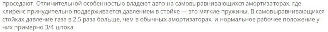 Так называемые «самовыравнивающие» стойки, ничего не выравнивают. Они как бы стараются удерживать высоту кузова на одном уровне. Мало нагрузки — аморты слабоваты. Много нагрузки — аморты становятся жёстче.