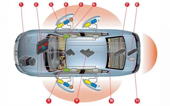 Основные элементы системы бесключевого доступа: 1 — блок управления двигателем; 2 — блок управления системой бесключевого доступа; 3 — датчик открытия двери; 4 — датчик закрытия двери; 5 — антенна; 6 — блок управления и привод центрального замка; 7 — антенна в багажнике; 8 — антенна в крышке багажника; 9 — антенны в салоне; 10 — антенна на заднем стекле; 11 — привод крышки багажника.