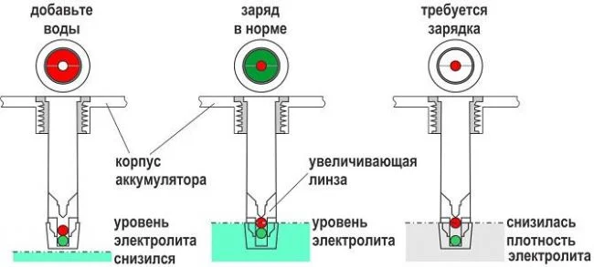 Глазок аккумулятора — это ареометр для одной банки, что делается в соседних — он понятия не имеет. Замерьте плотность электролита ареометром. В каждой банке. И уже потом делайте выводы о состоянии аккумулятора.