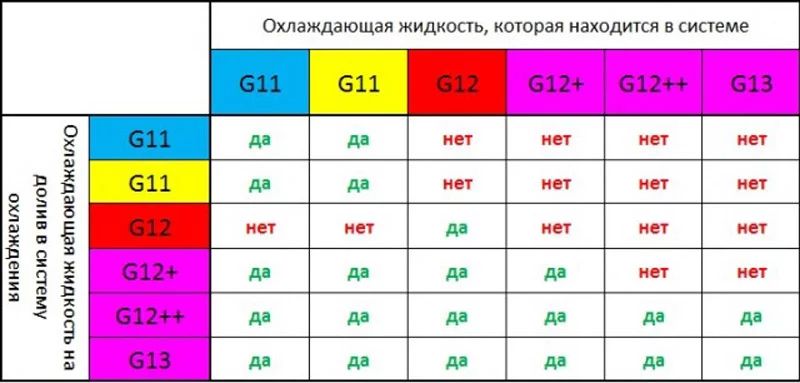 И на всякий случай, может пригодится в будущем, таблица совместимости антифризов (именно совместимости, то есть когда на доливку — можно их соединять или нет)
