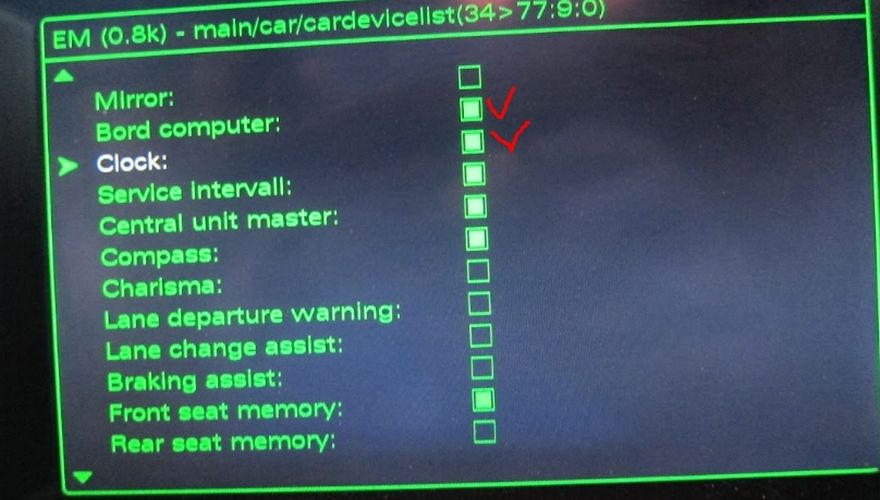 Зажмите кнопку Setup, затем Сar. Далее в зеленом меню выберите “Car-cardevicelist” и поставьте галочку напротив двух пунктов меню “Clock” и “Bord Computer”.