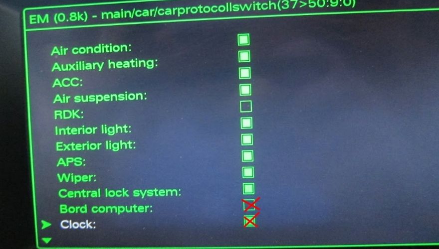 Далее зайдите в “car-carprotocollswitch” и уберите галочки с пунктов меню “Clock” и “Bord Computer”.