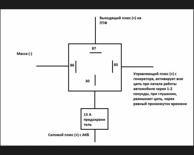 Можно сделать от датчика давления. Для этого соеденяем контакты реле 30 с 85, а вывод реле 86. Садим не на массу, а на вывод датчика давления масла. После запуска, как в системе появится давление ПТФ включатся.