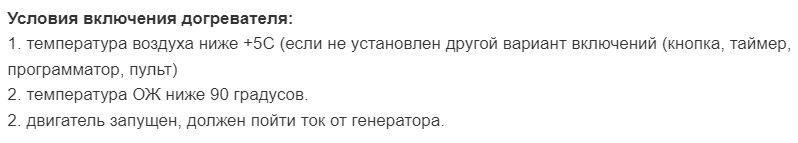 Подогреватель должен автоматически включаться при условиях указанных. ниже. Описание взято по ссылке .