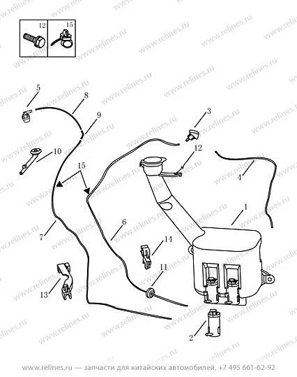 Бачок стеклоомывателя держится на двух болтах (крепёжные уши бачка видны на рисунке), болты нужно открутить и потянуть сам бачок