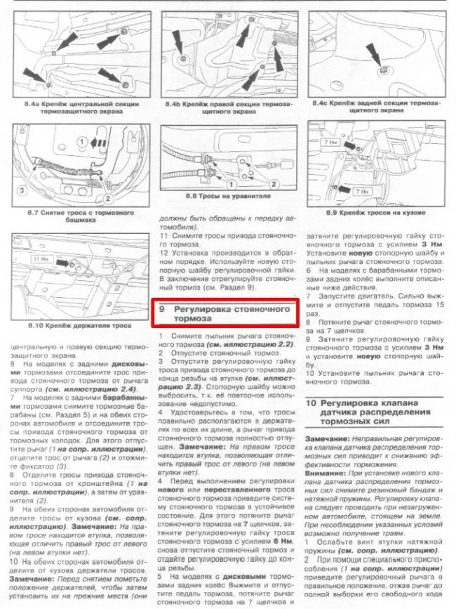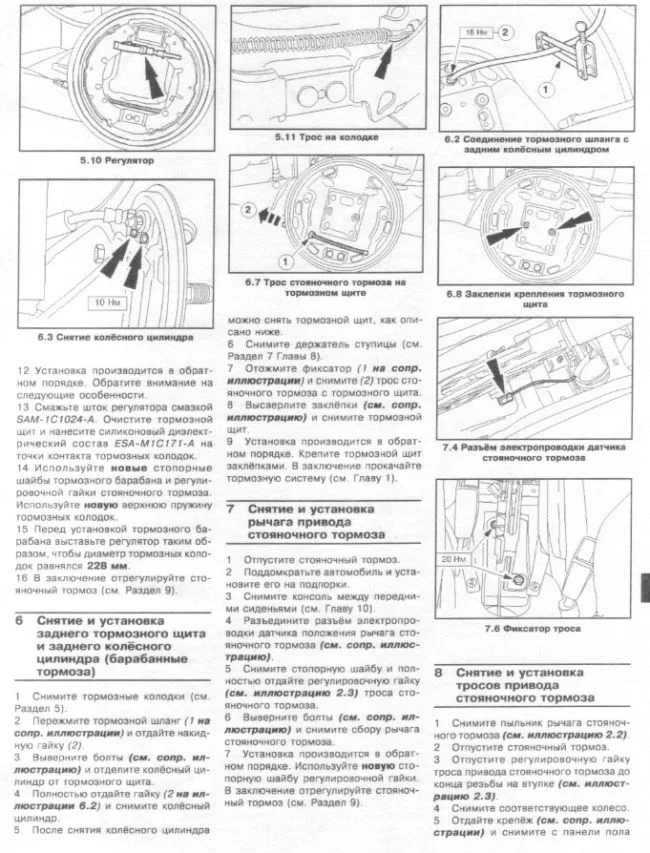 Ниже привожу выдержку про регулировку стояночного тормоза (она вам всё-равно пригодится). Там пишется о подтяжке троса «ручника». А вы наоборот его ослабьте перед снятием заднего тормозного барабана).