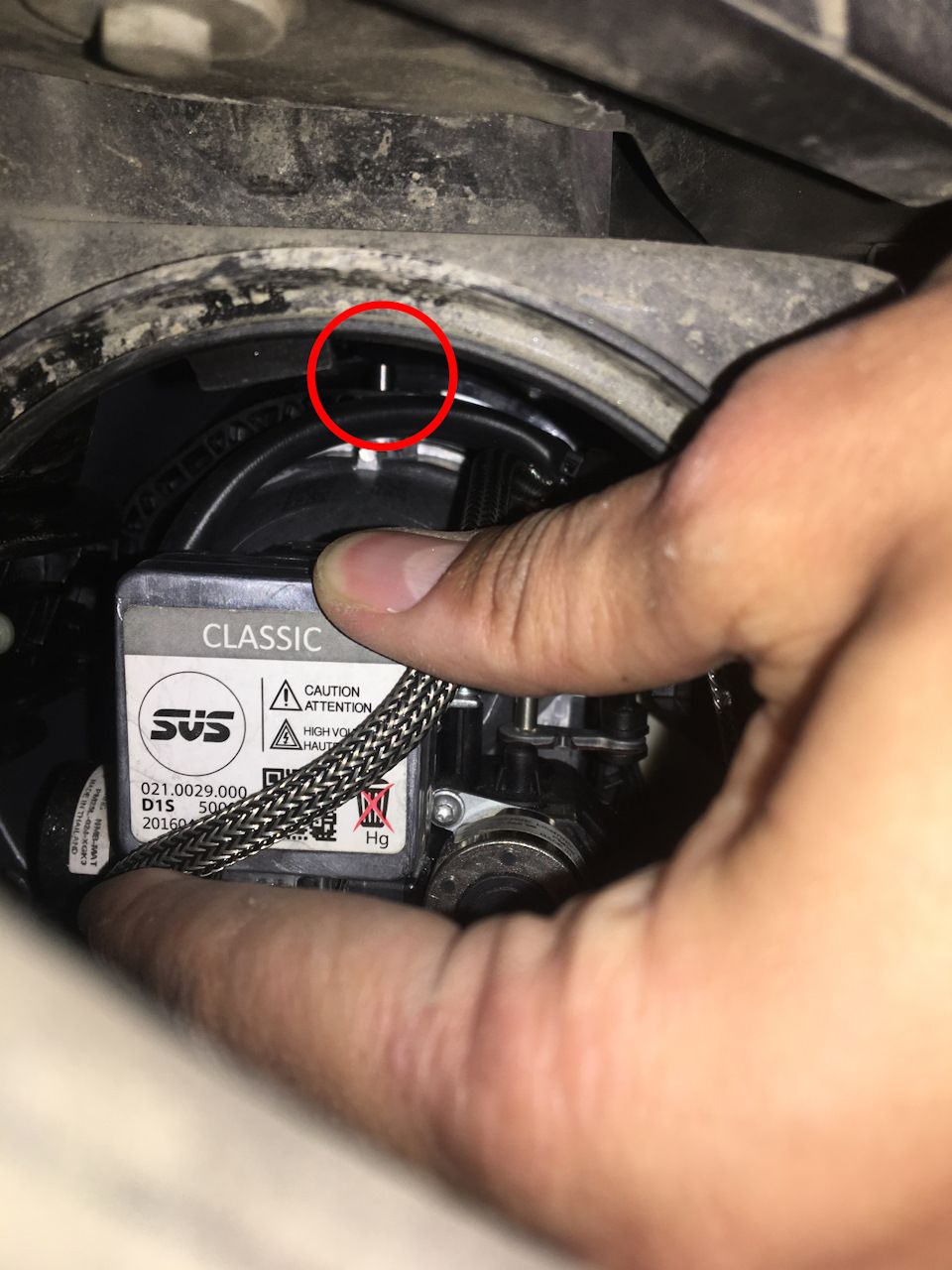 Снимите крышку с фары и увидите металлический штифт. Скорее он выпал, поэтому линза не фиксируется на месте. На фото увидите как установлен этот штифт.
