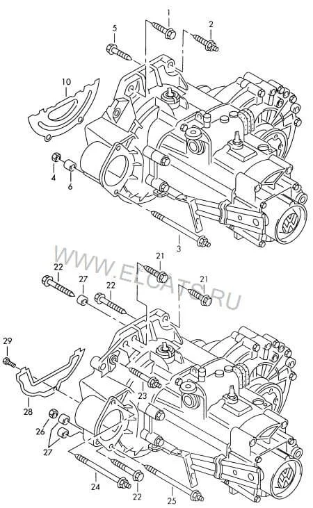 Какие болты крепят МКПП к двигателю в Фольксваген Гольф 4?