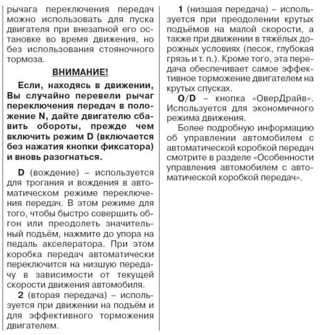 А вот O/D (овер/драйв) никогда не была экономичным режимом движения (мануал врёт, впрочем я это знал, что не все инструкции правдивы). Кнопка отключает высшую передачу, это удобно например зимой ездить в городе в условиях гололёда. Ну то есть если ваша АКПП имеет 4 передних передачи, то при нажатии на O/D, будут включаться только 3 передачи.
