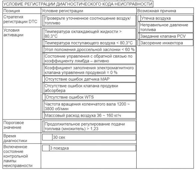 Эта ошибка может быть связана с не учтённым подсосом воздуха во впускной коллектор или связана с недостатком топлива.