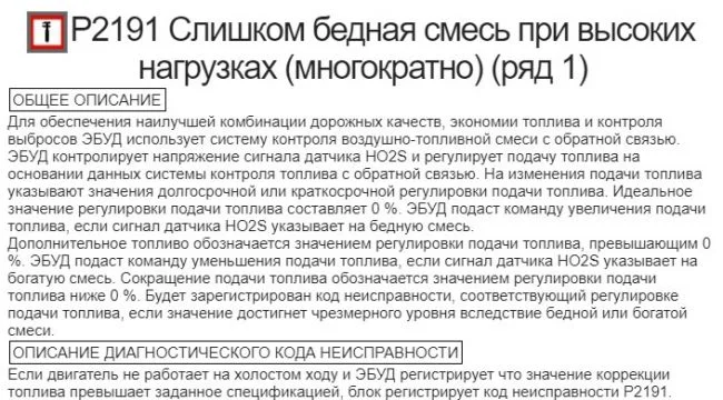 Горит ошибка Р2191-слишком бедная топливно-воздушная смесь при высокой нагрузке банк 1. С чем может быть связана проблема?
