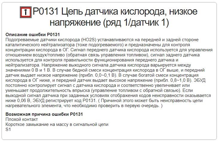 P0131 — Подогреваемый кислородный датчик 1, банк 1 — низкое напряжение. Проверьте еще герметичность выпускного коллектора. Ниже описано подробно по ошибке.