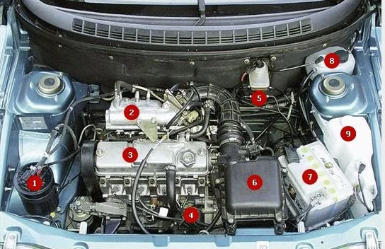 Правее фильтра установлен аккумулятор, правее которого, в свою очередь, стоит бачок омывателя. Справа вверху за опорой стойки расположен расширительный бачок. Главный тормозной цилиндр находится левее от этой же опоры стойки. Слева от мотора довольно много места занимает адсорбер системы улавливания паров бензина.