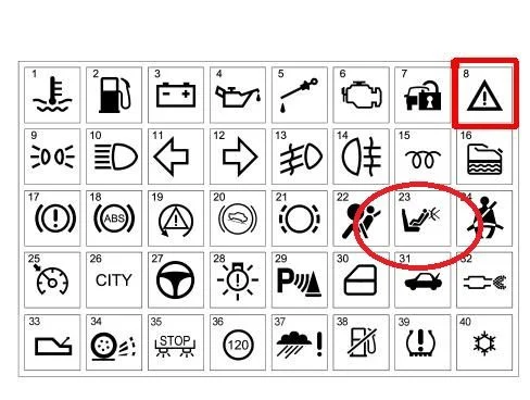 Это аирбэг детский предупреждение. Сейчас надо точно найти как он обзывается. А восклицательный это типа внимание сопутствующий с 23.