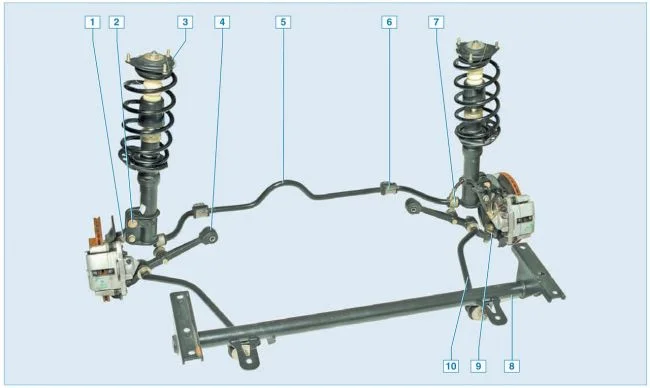 Вот ваша подвеска. И если кроме стоек, говорить об изнашиваемых деталях, это сайлентблоки, шаровые опоры. И я бы ещё добавил наконечники рулевой тяги(которые на этом рисунке не показаны, так как они относятся к рулевому управлению).