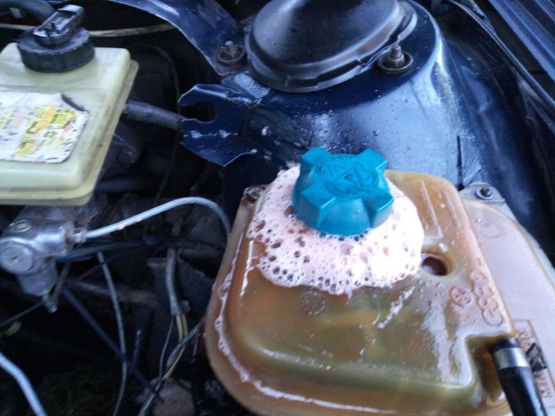 Если мотор ещё не прогрелся до температуры открытия термостата (на это наталкивает мысль о холодном патрубке радиатора), тогда значит подходит версия о пробитой прокладке ГБЦ.