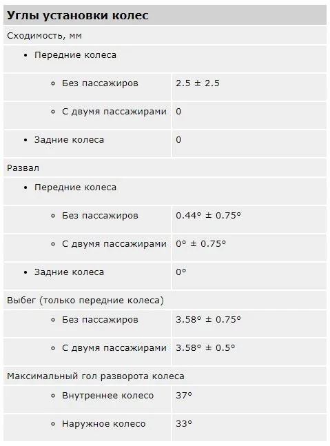 Попробуйте выбрать ваш автомобиль тут, в разделе «Данные по ходовой части» должны быть значения углов установки колес. Так же прикладываю данные с другого источника.