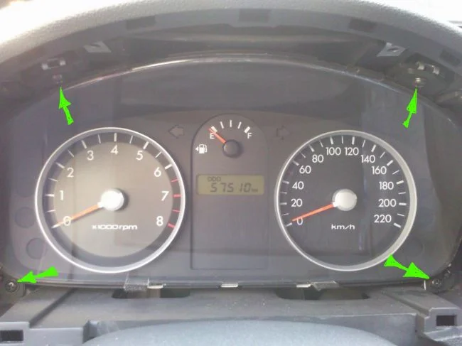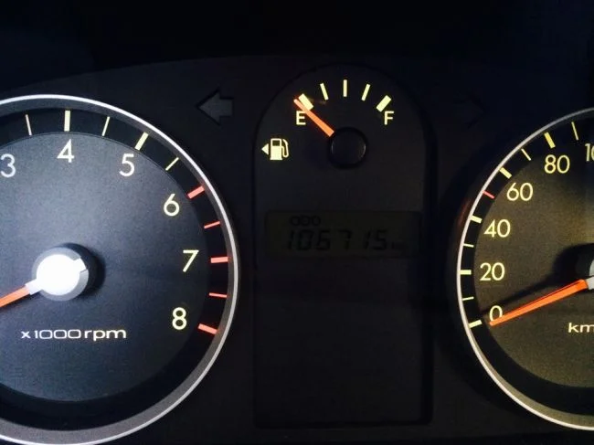 Здравствуйте. Лампа низкого уровня топлива загорается примерно при остатке 8 литров, у некоторых стрелка при этом заходит на «E», у некоторых когда стрелка на последней метке. Но вы же снимали стрелку с обесточенного щитка приборов, на фото примерное расположение стрелки без напряжения.
