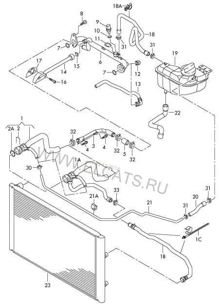 На Audi A8, двигатель 3,7 л., датчик ОЖ, №9 (на патрубке, вверху рисунка)