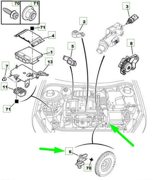 Датчик положения коленвала указан ниже. Регулятора холостого хода видимо нет, дроссельная заслонка электронная, если на ней один разъем, то нет РХХ, холостой ход обеспечивается приоткрытием дроссельной заслонки.