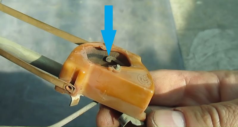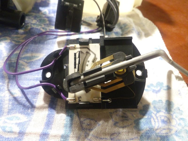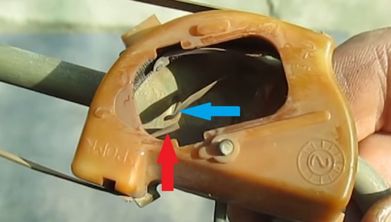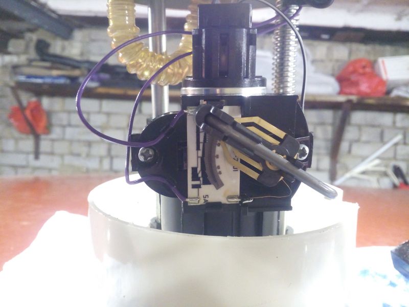 На фото ниже показаны контакты, которые при соприкосновении подают сигнал на лампочку сигнала о критическом уровне топлива в баке (красная стрелка — принимающий контакт лампочки; синяя стрелка — контакт поплавка подающий сигнал).