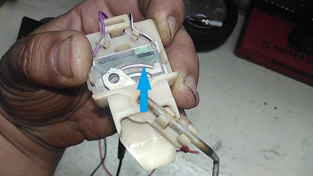 Из-за того, что механизм постоянно находится в неблагоприятной среде бензина, со временем на поверхности проволочек и самого контакта появляется налет, а также и волоски могут перетереться. Когда происходит перетирание какого-либо из секторов, показания датчика на шкале перестают быть достоверными, стрелка может либо показывать неверный уровень топлива, либо может упасть на ноль.