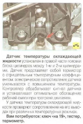 Сигнал датчика используется для вывода информации о температуре на панель приборов на указатель температуры двигателя.