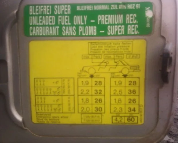 Хреновато видно. Левая таблица давления: количество пассажиров + груз, размер дисков и резины. В середине: передние колеса, давление в kg/m^2 и в psi. Правая таблица для задних колес давление в kg/m^2 и в psi. На манометре как правило есть шкала в kg/m^2 и в psi.