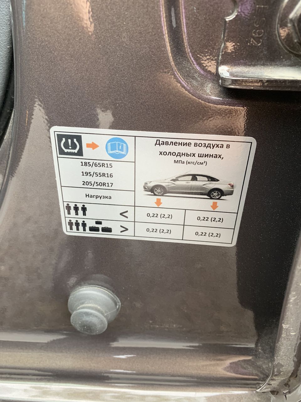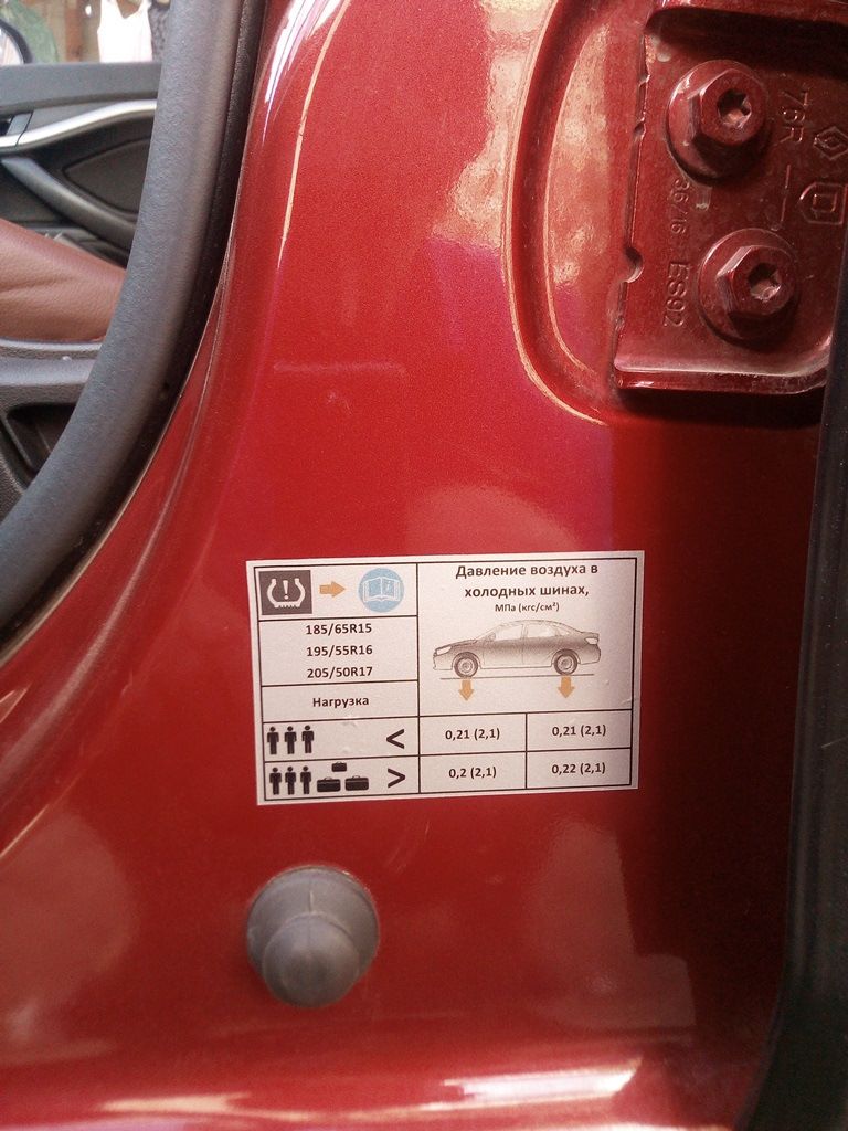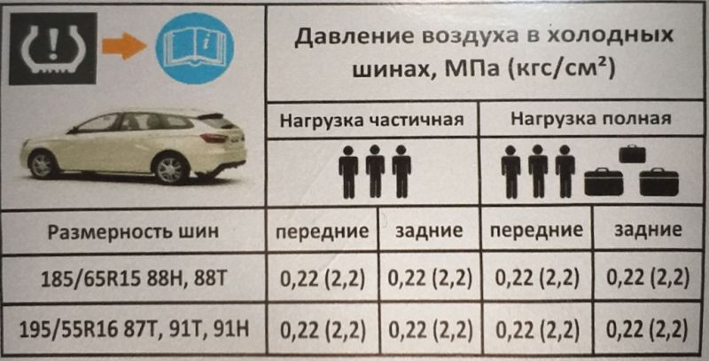 На кузове Весты (на центральной стойке возле водителя) в зависимости от комплектации, можно встретить несколько вариантов табличек, на которых указаны параметры давления в шинах передней и задней оси. Вот несколько основных вариантов: