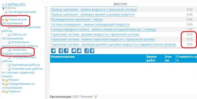 На странице автонорм выбираете своё авто. После выбора открывается список работ. В разделе «Техническое обслуживание» выбираете пункт «Смазочно-заправочные работы». В открывшемся списке справа в самом низу.