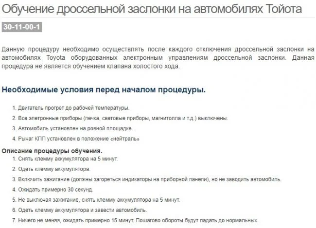 Бред написан в обучении дроссельной заслонки! Наверное взято откуда-нибудь с форума или с клубной переписки. НИКОГДА не отключайте и не подключайте аккумулятор при включенном зажигании. Никогда этого не делайте, если хотите чтобы ЭБУ оставался в исправном состоянии. Это же перепад напряжения, причём он может быть сильным, а электроника не любит такого.