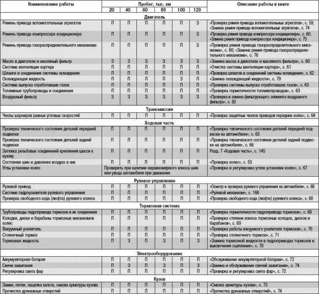 Таблица для своевременного технического обслуживания. Соответственно П — проверка, З — замена.