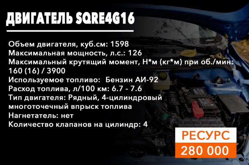 SQRE4G16 – мотор на 1.6 литра, которым стали оснащать автомобиль начиная с 2016 года, производит 126 лошадиных сил;