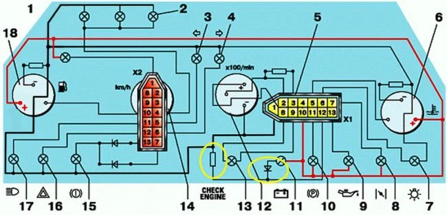 Взял схему приборного щитка и выделил возможные проблемные места.