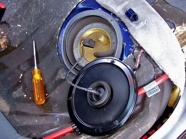 Он находится под задним пассажирским диваном в салоне машины, вот под этой обшивкой.