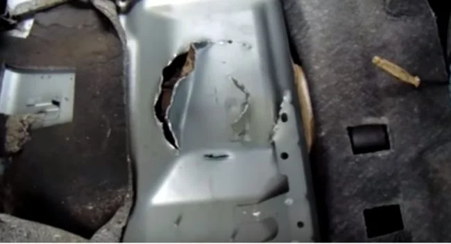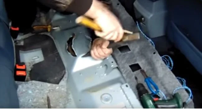 Хотя, при отсутствии ямы или подъёмника, некоторые умельцы просто вырубывают или вырезают отверстие в кузове для возможности замены. На фото ниже процесс как это делается.