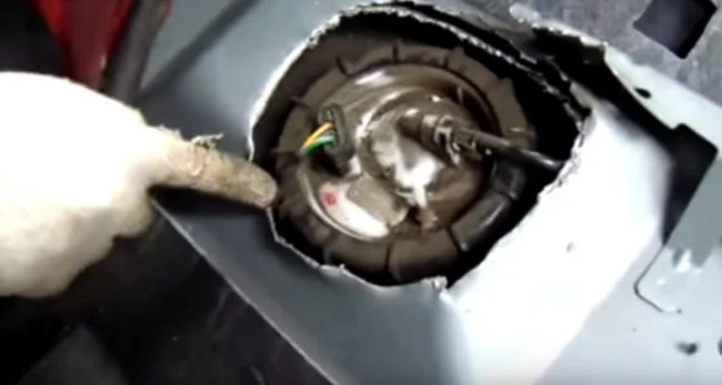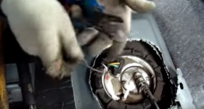 Момент по снятию колодки проводов с бензонасоса. Рекомендуют согнуть металлический штырёк, гвоздик и зацепить фиксатор колодки снизу. Так как есть опасность сломать фишку.