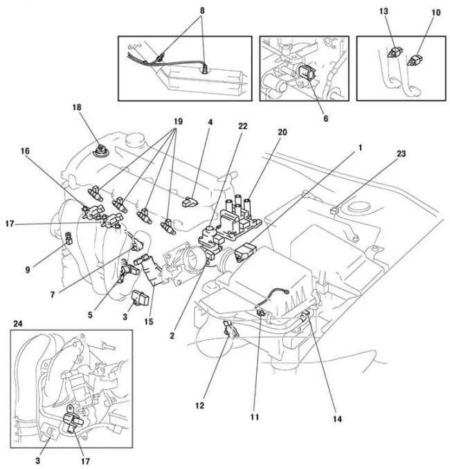 Где находиться датчик охлаждения жидкости в Мазда 6?