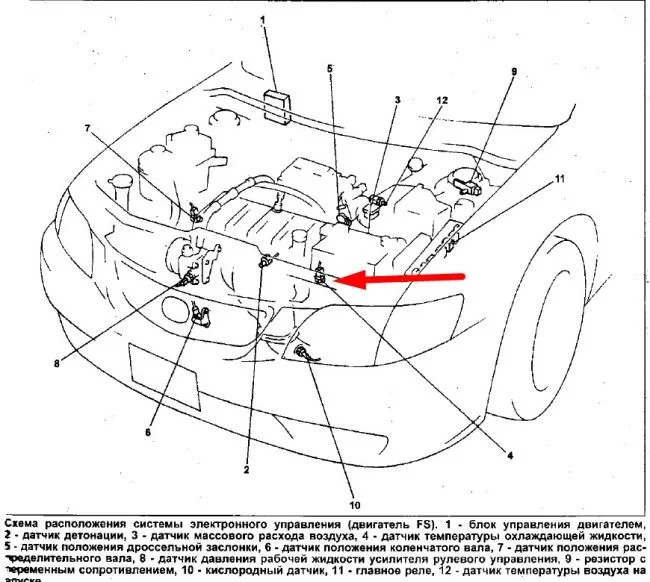 Где находится датчик температуры двигателя в Мазда МПВ?