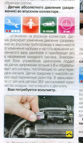 Ну таки датчик абсолютного давления вам показали. Но есть вариант шо вам нужен датчик ТЕМПЕРАТУРЫ всасываемого воздуха — он корпусе впускного коллектора или корпусе воздушного фильтра (скорее всего фильтра)