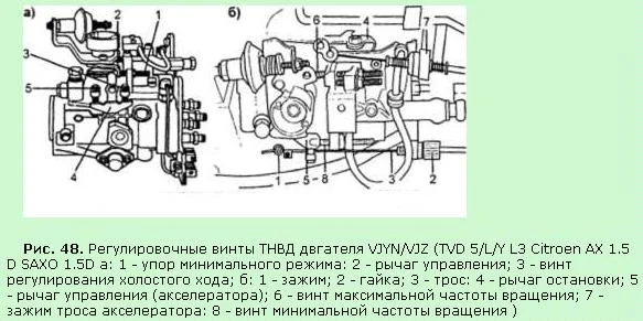 Расположение регулировочных винтов ТНВД дизеля CITROEN показано на рис. 48 а, б.Перед началом регулировки прогреть двигатель и отключить все вспомогательное оборудование. Частота вращения для дизелей АХ должна быть 775 ±25 мин-1, для дизелей Saxo — 800+25 мин-1, частота вращения ускоренного холостого хода -1000±25мин-1.1. Запустить и прогреть двигатель.2. Отвернуть винт 1 до появления зазора между винтом 1 и рычагом управления 2.3. Отрегулировать частоту вращения винтом холостого хода 3.Регулировка ускоренного холостого хода:4. Двигатель холодный — рычаг 4 (рис. 48. а) должен быть на упоре (рис 48. а).5. Если нет, отрегулировать натяжение троса, используя зажим 1 (рис. 48, б), тонкую регулировку осуществлять гайкой с накаткой 2 (рис. 48. б).6. Прижать рычаг 4 к винту 5 (рис. 48, а) и отрегулировать ускоренный холостой ход винтом 5.7. На прогретом двигателе трос 3 (рис. .48, б) должен быть в прослабленном состоянии.Регулировка против произвольной остановки двигателя:8. Вставить щуп толщиной 1 мм между рычагом управления 2 и винтом 1 (рис. 48, а).9. Отрегулировать частоту вращения в соответствии с техническими условиями.10. Вынуть щуп.11. Увеличить частоту вращения до 3000 мин-1 поворотом рычага управления 2 и отпустить рычаг.12. Частота вращения должна уменьшаться до холостого хода в течение 2-3 секунд.